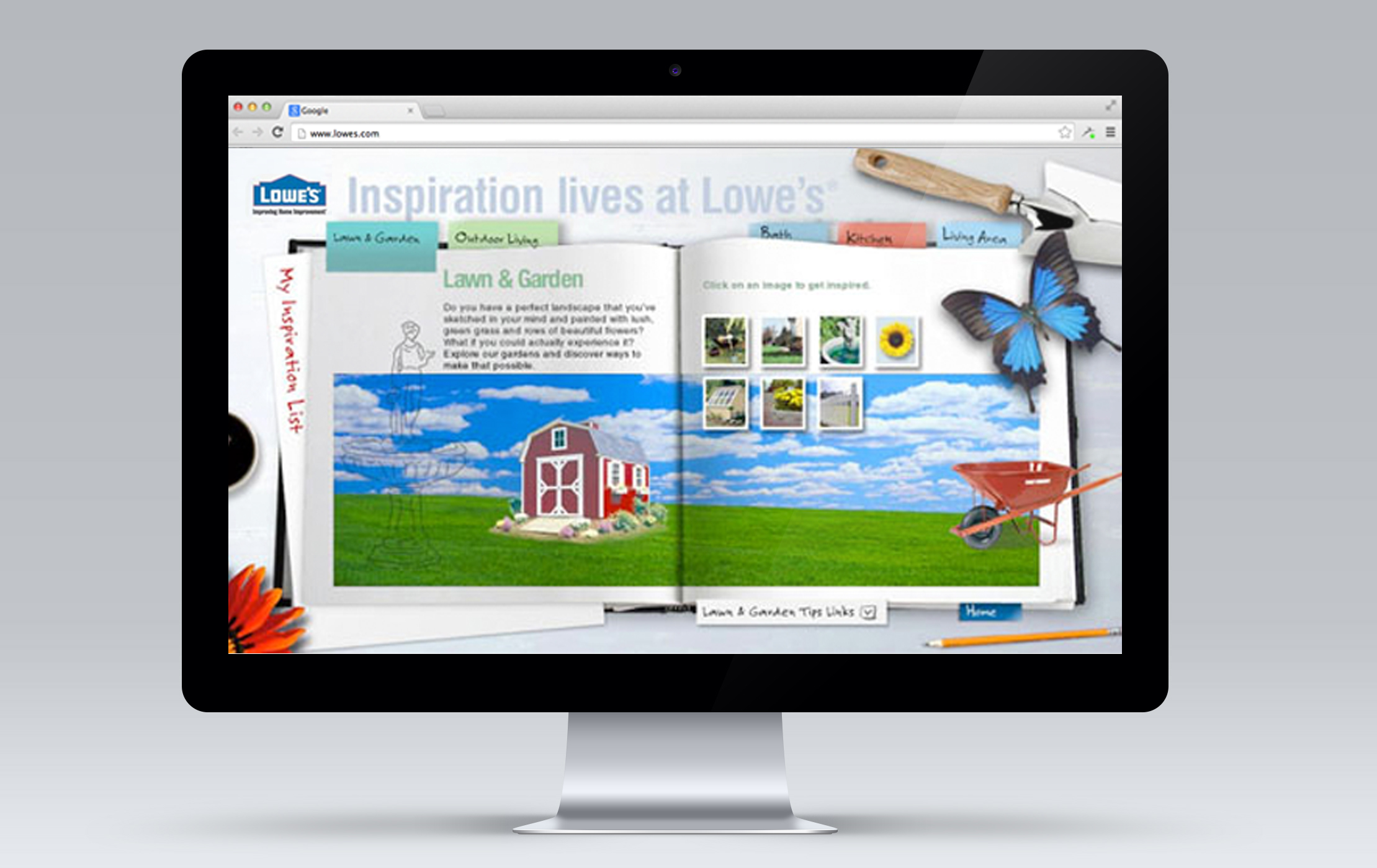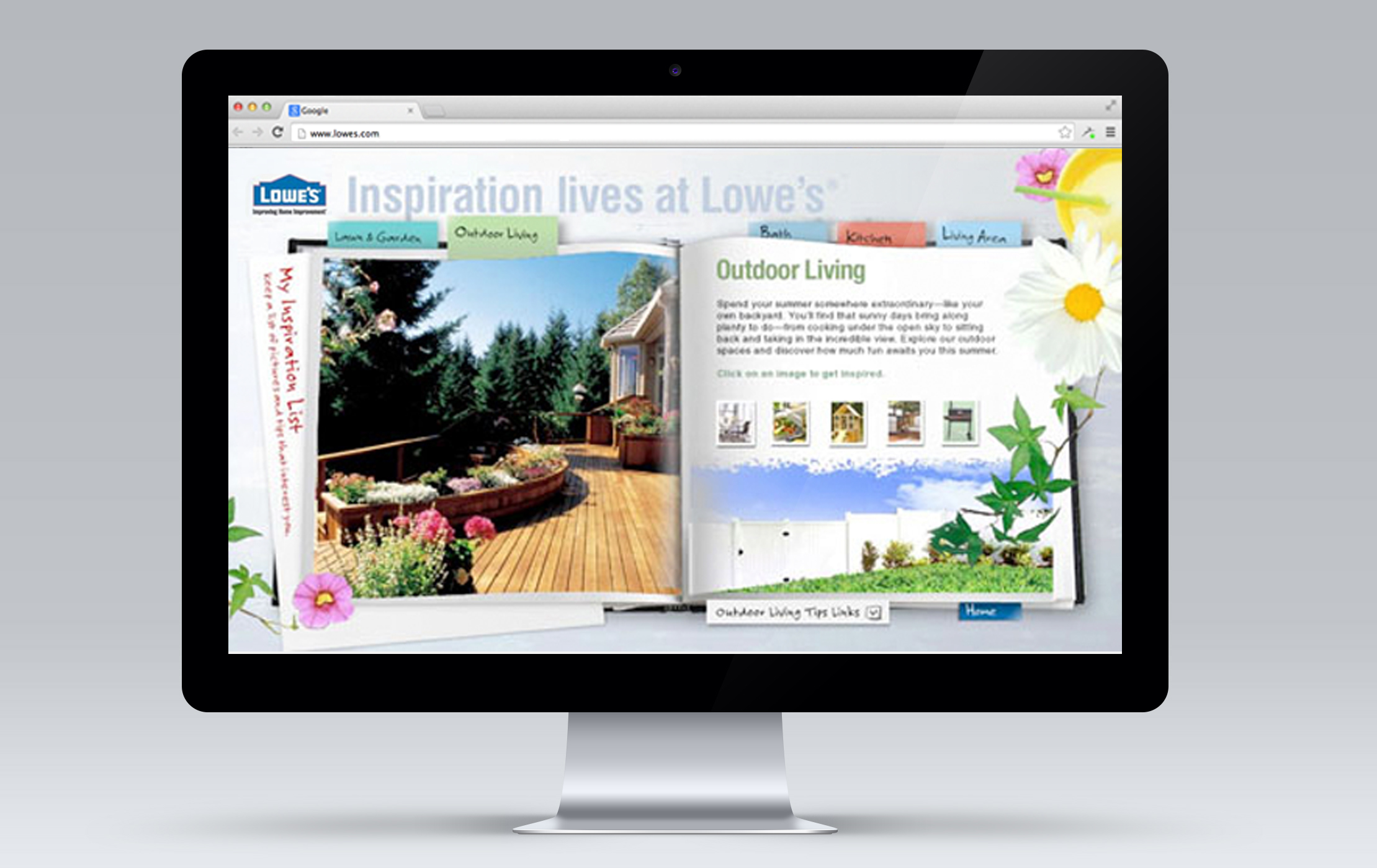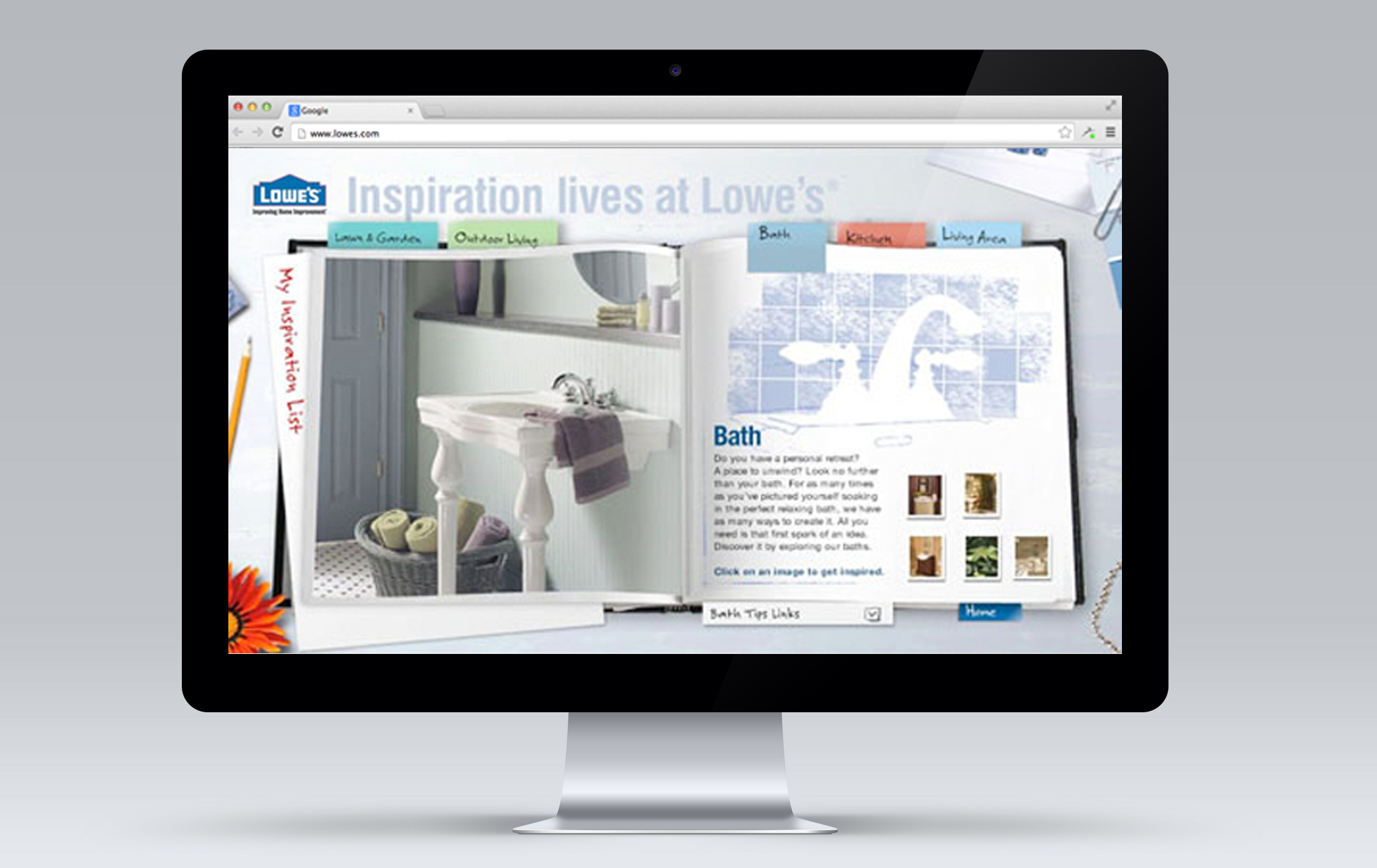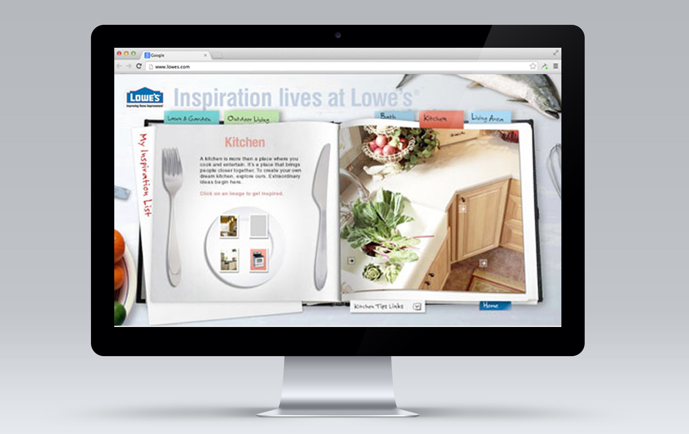 Lowe’s wrote the book on home improvement and we helped put it together. Its title: Inspiration lives at Lowe’s. It’s a microsite in the guise of a help book, and it covers every facet (and faucet) of home improvement. Each “chapter”, devoted to one section of the house, is filled with tips, pictures and insightful articles. Consumers can easily explore different look and feels for their kitchens, bathrooms and outdoor areas. If they don’t know what they’re looking for, the site provides sparks for ideas.